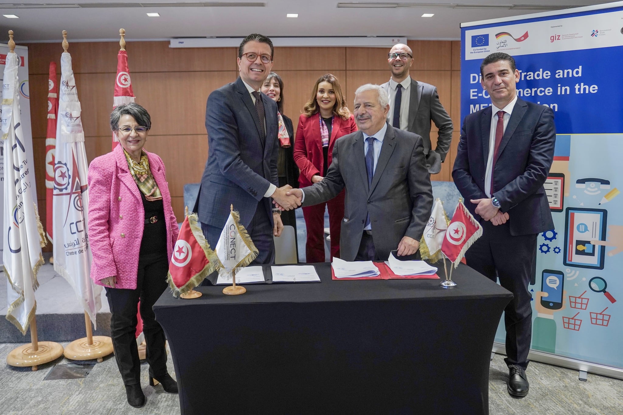 Dans le cadre de la mise en oeuvre du programme régional Digital Trade and E-Commerce in the MENA Region, une conférence de presse s’est tenue ce jour à Tunis, marquant l’annonce du partenariat entre les deux Business Support Organizations (BSOs) en Tunisie La Chambre de Commerce et de l’Industrie de Tunis et la Confédération des Entreprises Citoyennes de Tunisie CONECT et le Centre du Commerce International (ITC) agence conjointe des Nations Unies et L’Organisation Mondiale du Commerce et le ministère du commerce et du développement des Exportations.