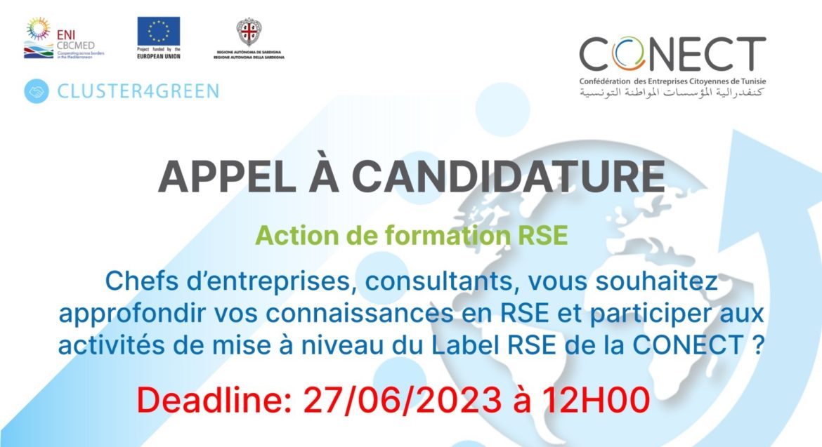 Chefs d’entreprises, consultants, vous souhaitez approfondir vos connaissances en RSE et participer aux activités de mise à niveau du Label RSE de la CONECT ? ⏳ 𝗗𝗮𝘁𝗲 𝗹𝗶𝗺𝗶𝘁𝗲 𝗱’𝗶𝗻𝘀𝗰𝗿𝗶𝗽𝘁𝗶𝗼𝗻 : 𝟮𝟳 𝗷𝘂𝗶𝗻 𝟮𝟬𝟮𝟯𝗮̀ 𝟭𝟮𝗛𝟬𝟬 ⏳ Participez à la formation RSE organisée par la CONECT La CONECT a le plaisir de vous informer que cette activité s’insère dans le cadre Du projet Cluster4Green. Avec le soutien de l’Union Européenne, ce programme vise à promouvoir les synergies entre les PME, les décideurs politiques, les investisseurs et les autres parties prenantes. Et ce, dans le cadre du projet financé par ENI CBC MED. La Formation vise à la mise en conformité du label RSE de la CONECT en vue de sa reconnaissance à l’international en tant que label RSE engagé « Responsibility Europe ». Le programme de formation couvrira les exigences de l’ISO 26000 et des label RSE Les personnes qui bénéficieront de la formation devront s’engager à: ✔ Participer activement aux activités de mise à niveau du label RSE de la CONECT, et/ou ✔ Participer activement aux activités d’accompagnement des entreprises pour élaborer un diagnostic sur la base de l’outil « Impact Rating » et arrêter un plan d’action afin que l’entreprise puisse engager les actions nécessaires à son développement durable, et/ou ✔ Assurer des activités de sensibilisation à la RSE et au Label de la CONECT dans les régions. Les candidats retenus pour la formation signeront un engagement dans ce sens. Inscrivez-vous 📧chargee.projets@conect.org.tn ⏳ 𝗗𝗮𝘁𝗲 𝗹𝗶𝗺𝗶𝘁𝗲 𝗱’𝗶𝗻𝘀𝗰𝗿𝗶𝗽𝘁𝗶𝗼𝗻 : 𝟮𝟳 𝗷𝘂𝗶𝗻 𝟮𝟬𝟮𝟯𝗮̀ 𝟭𝟮𝗛𝟬𝟬 ⏳ NB : La formation est a priori programmée pour la première semaine de juillet.