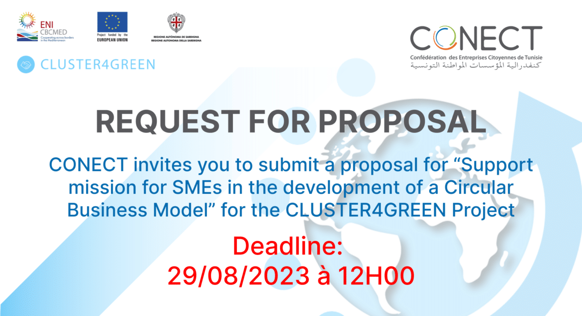 CONECT invites interested parties to submit their bids for the Support Mission for SMEs in the development of a Circular Business Model for the CLUSTER4GREEN Project. The deadline for submission is August 29, 2023.