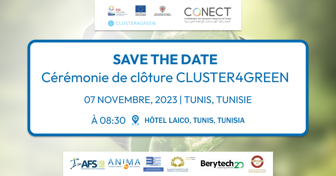 Nous avons le plaisir de vous inviter à la cérémonie de clôture de CLUSTER4GREEN, CONECT, qui se tiendra le 7 novembre 2023 à l’hôtel Laico, Tunis à 8.30 . Cet événement représente une occasion unique de partager des idées, d’inspirer l’action et de collaborer pour créer un avenir plus durable et résilient pour tous.