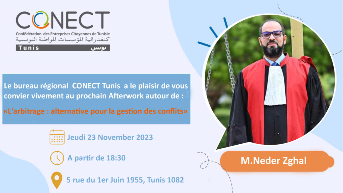 Le bureau régional CONECT Tunis a le plaisir de vous convier vivement au prochain Afterwork, qu’il organise le jeudi 14 décembre 2023, de 18h00 à 19h30 au siège de la CONECT NATIONAL, sis à 5 bis Rue 1er Juin 1955 (Mutuelle ville) sous le thème :