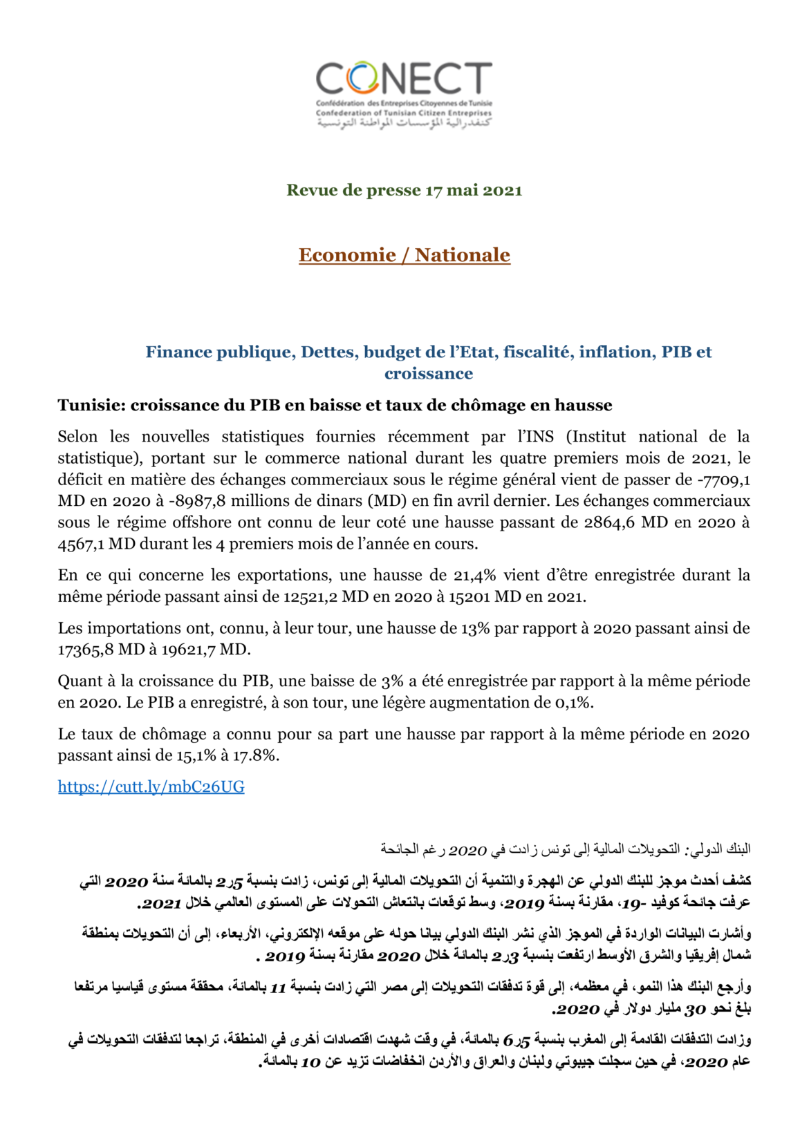 Revue de presse 17 mai 2021 by conect2022mtd 7 mars 2022 0 Commentaire 0 FacebookTwitterLinkedin conect2022mtd Articles précedent Revue de presse 08 juin 2021 Articles suivant مشروع مراجعة تراخيص تعاطي األنشطة االقتصادية