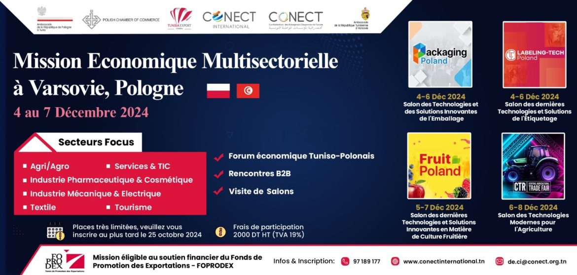 La CONECT International et le Centre de Promotion des Exportations (CEPEX) organisent, en collaboration avec l’Ambassade de Tunisie à Varsovie, l’Ambassade de Pologne à Tunis, et la Chambre Polonaise de Commerce – KIG, une Mission Economique Multisectorielle à Varsovie, Pologne du 04 au 07 Décembre 2024.