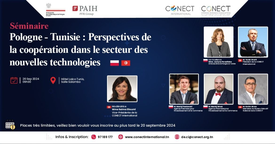 Séminaire « Pologne – Tunisie : Perspectives de la coopération dans le secteur des nouvelles technologies » qui aura lieu le Jeudi 26 Septembre 2024 à 9h30 Hôtel Laico Tunis