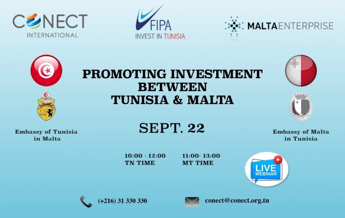 La CONECT International et Malta Enterprise ont le plaisir de vous inviter à participer au Webinaire qu’elles organisent , en partenariat avec l’Ambassade de Tunisie à Malte et l’Ambassade de Malte en Tunisie autour du thème «Promouvoir l’investissement entre la Tunisie et Malte » et ce le mercredi 22 Septembre 2021 de 10h00 à 12h00 ( Heure Tunis ) de 11h00 à 13h00 ( heure Malte ) .